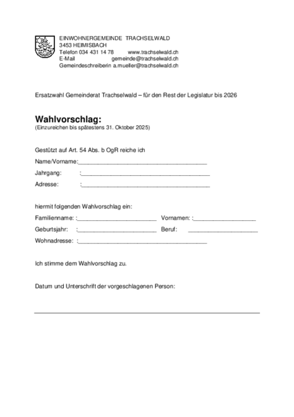 Jede stimmberechtigte Person kann bis spätestens am 31. Oktober 2025 bei der Gemeindeschreiberei zuhanden der Gemeindeversammlung Wahlvorschläge einreichen. Die Zahl der Vorschläge ist nicht begrenzt. Jeder Wahlvorschlag muss Familien- und Vornamen, Geburtsjahr, Beruf und die Wohnadresse sowie die schriftliche Zustimmung der Vorgeschlagenen enthalten. Ein Formular steht auf der Homepage unter Downloads zur Verfügung.